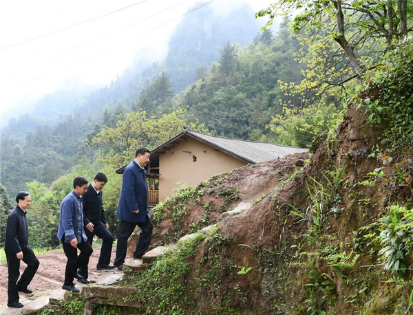 4月15日至17日,中共中央總書記、國家主席、中央軍委主席習(xí)近平在重慶考察,并主持召開解決“兩不愁三保障”突出問題座談會。這是4月15日下午,習(xí)近平在石柱土家族自治縣中益鄉(xiāng)華溪村察看自然環(huán)境、村容村貌。新華社記者 王曄 攝