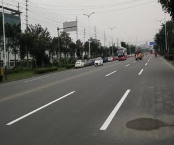熱熔型標線涂料在常溫下是固體粉末狀,施工時,將涂料投入熔融釜中,釜內溫度控制在180℃~210℃之間,邊熔化邊攪拌,待熔化呈熔融流動狀態后,放入劃線車的保溫熔融料斗中。溶融涂料接著背引入劃線斗中,并保溫使物料保持熔融狀態。劃線前有預標線機標記位置,按設計圖標明的涂敷位置上用下涂劑機涂敷底漆。待下涂劑徹底干后,方能涂敷標線涂料。開始劃線時,應把劃線斗放在路面上,由于劃線斗與地面間有一定的間隙,當劃線車前行時,靠自動流淌而刮抹出一條整齊的標線。玻璃珠撒播器能自動均勻地在標線上撒布一層反光玻璃珠。